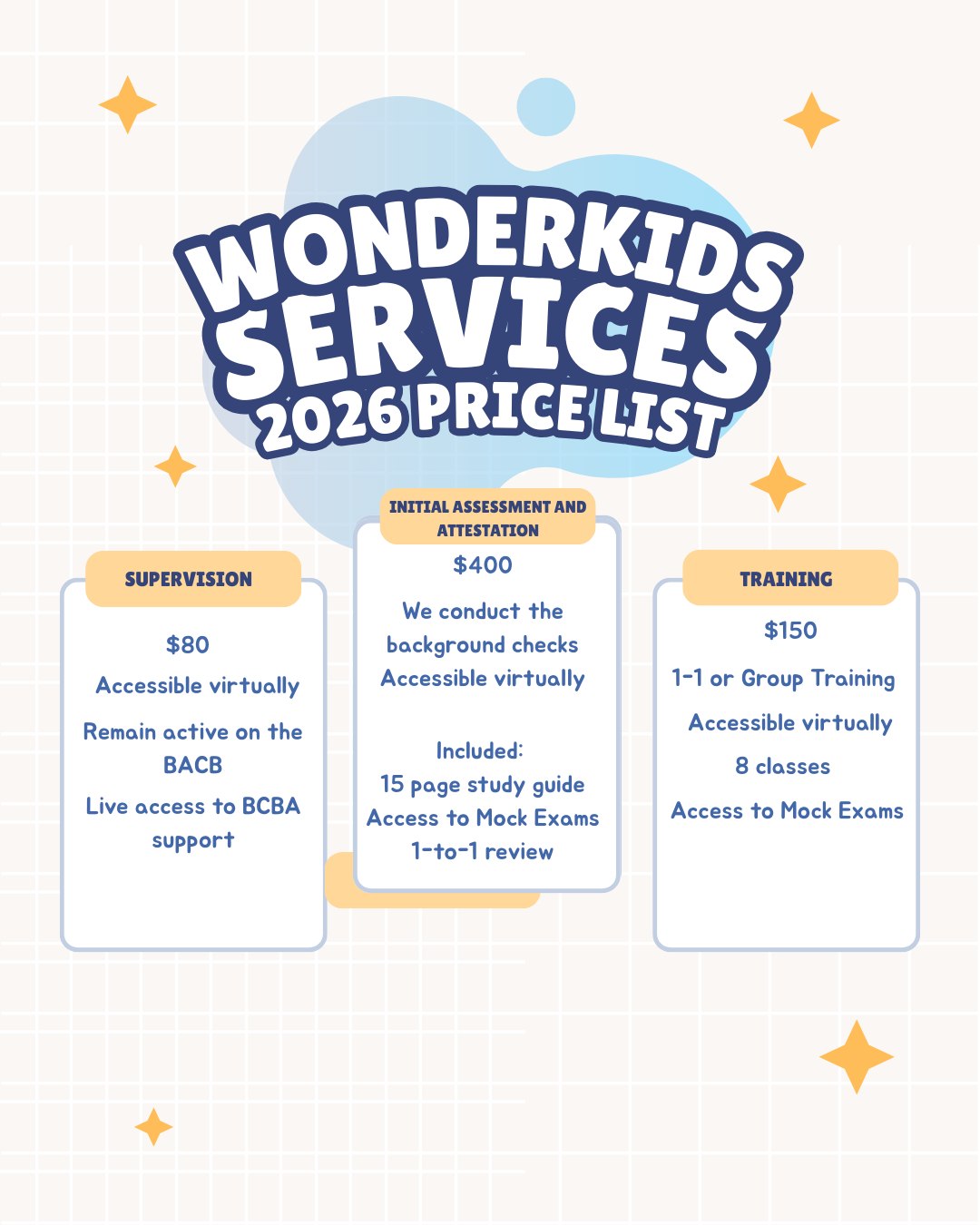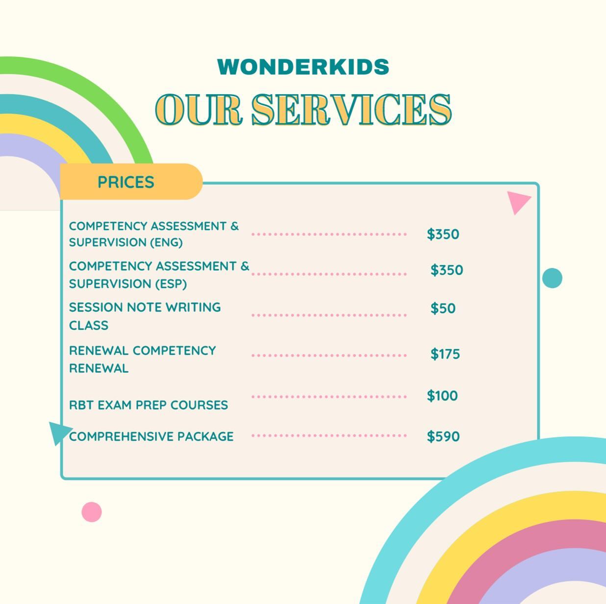 En Wonderkids Academy, ofrecemos una variedad de servicios que se adaptan a sus necesidades como estudiante de análisis de conducta. Nos esforzamos por crear una comunidad centrada en la defensa y el crecimiento. Ofrecemos todos los recursos necesarios para quienes comienzan su camino hacia convertirse en técnicos de conducta registrados o para quienes solo desean repasar el contenido y renovar su certificación. Nuestro programa de capacitación ha sido diseñado por BCBAs con más de 5 años en el campo, lo que optimiza sus posibilidades de éxito. Nuestros servicios se ofrecen en inglés y en español.